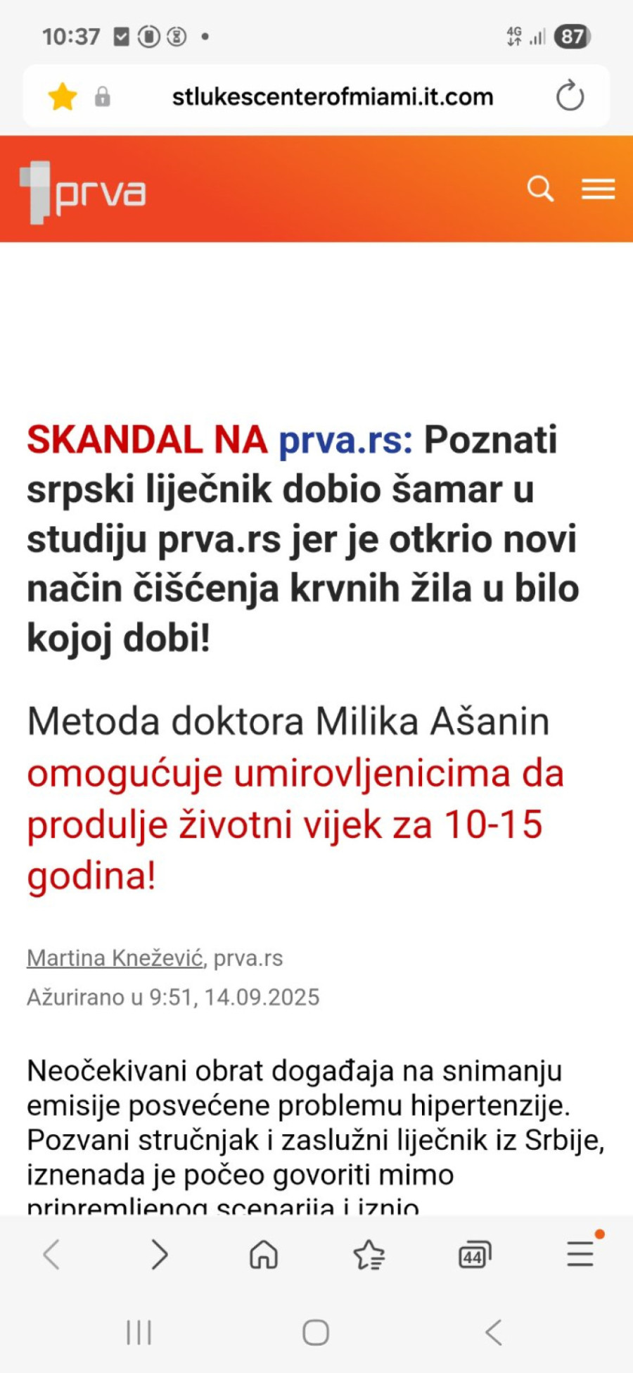 Sporna objava nalazi se na adresi koja ni na koji način nije povezana sa našim portalom, a u njoj se navodno prenose izjave dr Ašanina o „čudotvotnom leku za čišćenje krvnih sudova". Tekst koristi izgled i grafička obeležja našeg portala, ali Prva.rs nikada nije objavila takav intervju, niti ima bilo kakvu povezanost sa navedenim sajtom.