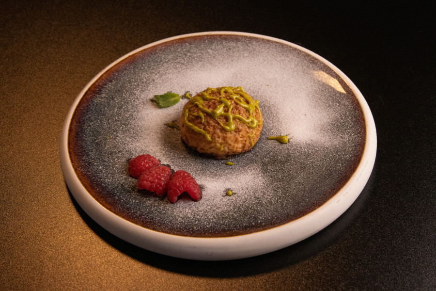 Elegantna mini mekika punjena ručno pravljenim svežim sitom od ovčjeg mleka obogaćenim potočarkom sa reke Gradac, simbolom čistog izvora. U srcu punjenja nalazi se riet od dimljene pastrmke, dok vrh jela nosi raskošnu krošnju tankih listića tartufa.