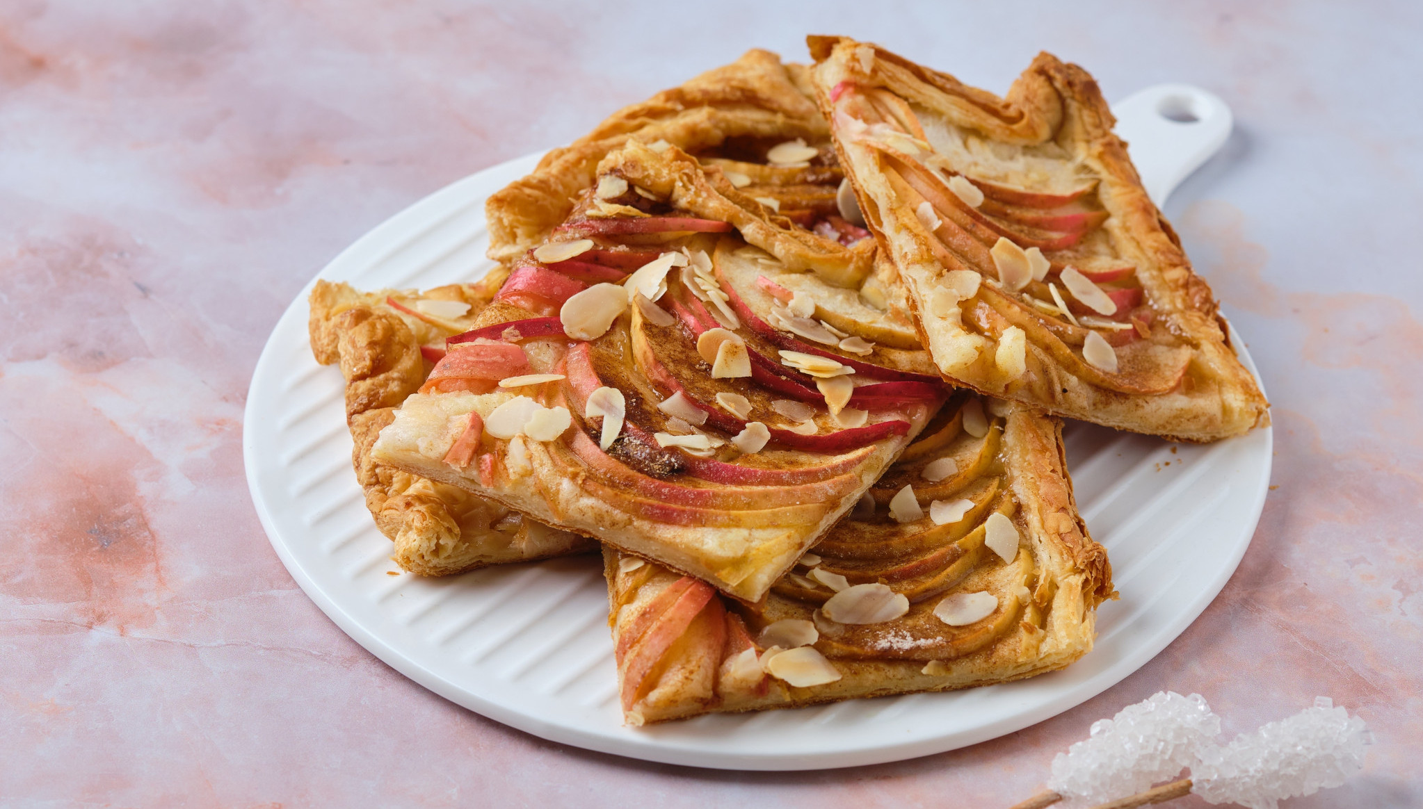 Testo istanjite oklagijom, pa isecite na kvadrate, pa zasecite i do 5mm po unutrašnjosti, duž ivice. Jabuke isecite na kolutove i izvadite im sredinu, pa ih uvaljajte u mešavinu šećera i cimeta. Zatim svaki kolut postavite na isečeni kvadrat, a zasečene ivice stavite na sredinu koluta, pa ih "zatvorite" orahom.
