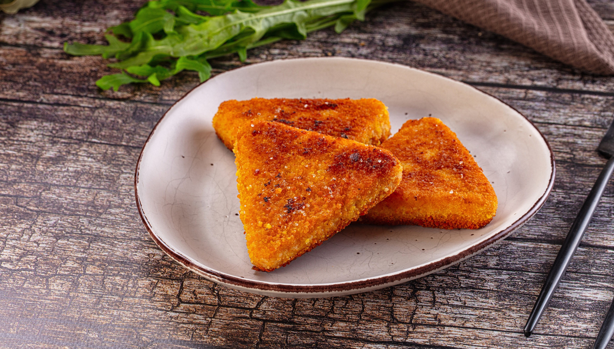 Iseći ivice sa tost hleba i istanjiti ga oklagijom. Hleb preseći po dijagonali, ivice namazati umućenim jajetom, staviti na jednu stranu kačkavalj i krem sir, pa preklopiti i zatvoriti. Umočiti u umućeno jaje, pa u prezle i staviti da se zapeče sa obe strane u tiganju sa zagrejanim uljem.