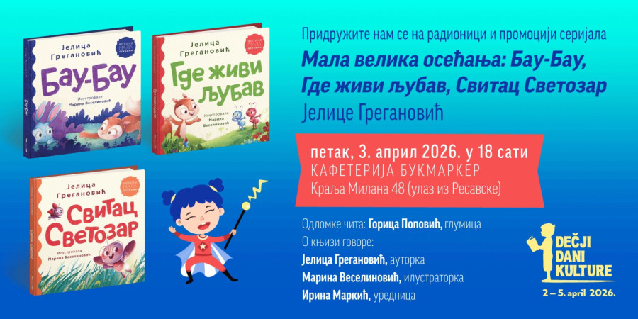Narednog dana, 3. aprila, takođe od 18 sati u knjižari Delfi SKC, bestseler autorka Jelica Greganović predstaviće slikovnice iz serijala „Velika mala osećanja“: „Bau-Bau“, „Gde živi ljubav“ i „Svitac Svetozar“, a za svoje male čitaoce pripremila je i mnogo drugih iznenađenja.