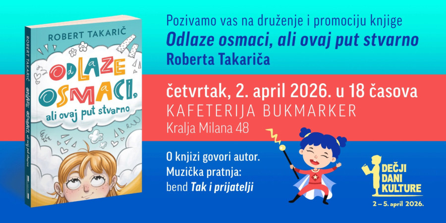 U knjižari Delfi SKC, u četvrtak 2. aprila od 18 sati družimo se sa hit piscem Robertom Takaričem, koji će predstaviti svoju novu knjigu „Odlaze osmaci, ali ovaj put stvarno“.