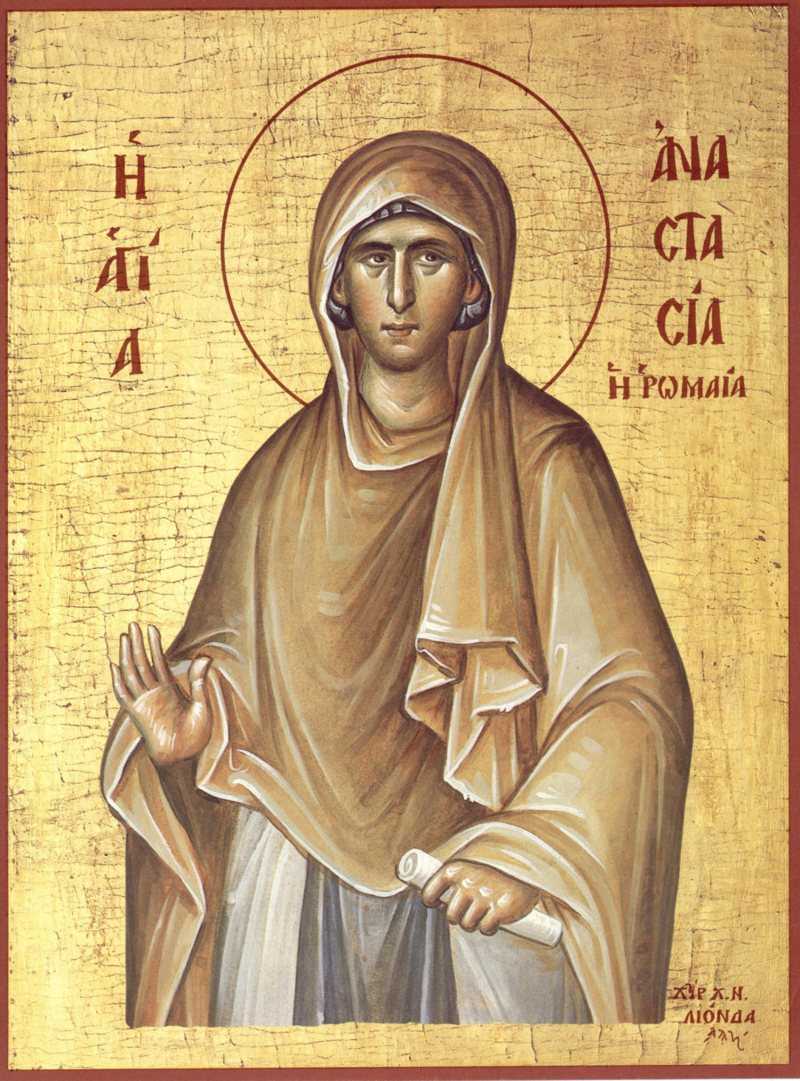 O životu svete Anastasije se malo toga pouzdano zna, ali veruje se da je rođena u Rimu u bogatoj porodici oca paganina i majke hrišćanke. Od malih nogu Anastasija se okrenula ljubavi ka Gospodu, a čak i kada ju je otac primorao da se uda za neznabožačkog vlastelina, bila je rešena da ostane devica.